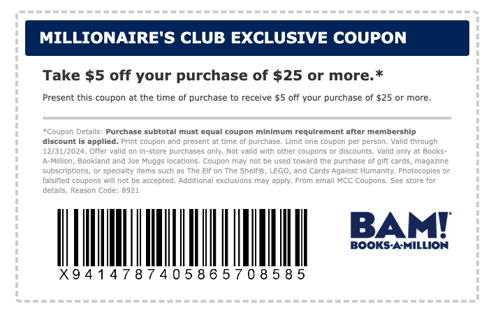 Books a Million has a discount code that’ll save you $5 off $25+ orders. The promo code is valid for in-store Millionaire’s Club members only. Here it is: