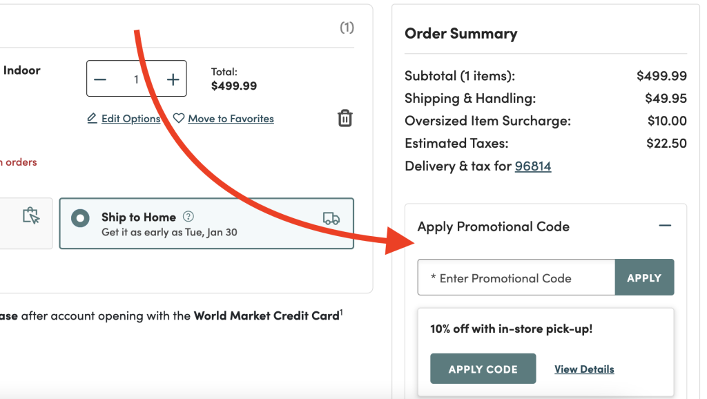 Always check the full terms and conditions of the coupon. It may be expired, or it might not apply to the type of item(s) you’re attempting to purchase. For example bulky and heavy items like large area rugs are frequently exempt from free shipping promotions due to the fact that they are more expensive to ship than smaller items. A promo code may also only be valid for members of the World Market Rewards program. In that case, it’s free & easy to create an account if you don’t already have one.