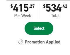 The top of the screen will mention that the coupon code rates are active. And all the cars the special promotion applies to will say “promotion applied” underneath the green “select” button.